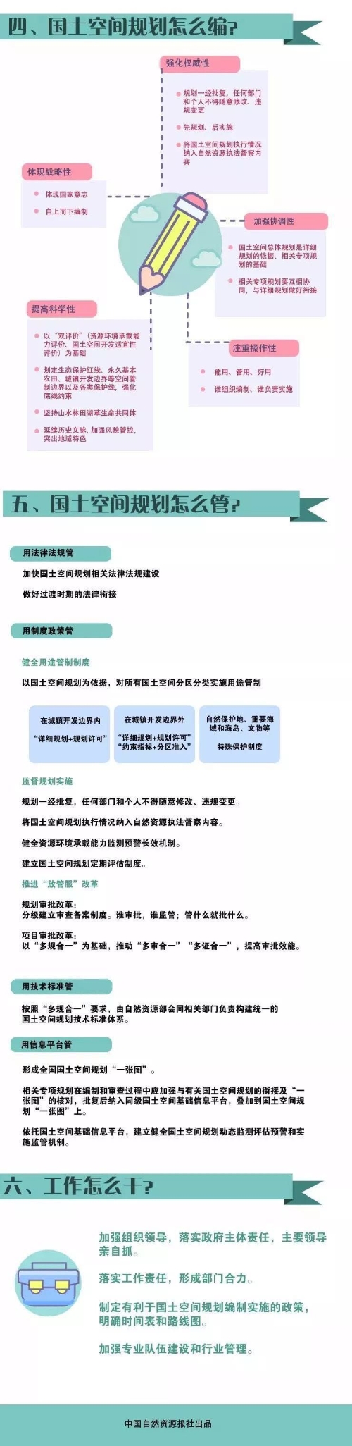 自然资源部将继续坚持党对规划工作的领导,按照确定目标,坚定不移推进和实施“多规合一”,形成“一本规划、一张蓝图”,建立统一的编制审批体系、实施监督体系、法规政策体系和技术标准体系,构建统一的基础信息平台,形成全国国土空间开发保护“一张图”,落实好《若干意见》各项部署,实现国土空间开发保护更高质量、更有效率、更加公平、更可持续。