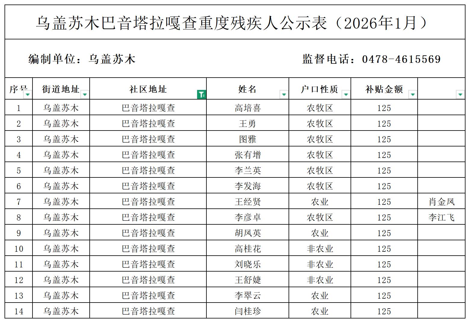 【巴音塔拉嘎查】乌盖苏木巴音塔拉嘎查2026年1月重度残疾人公示表