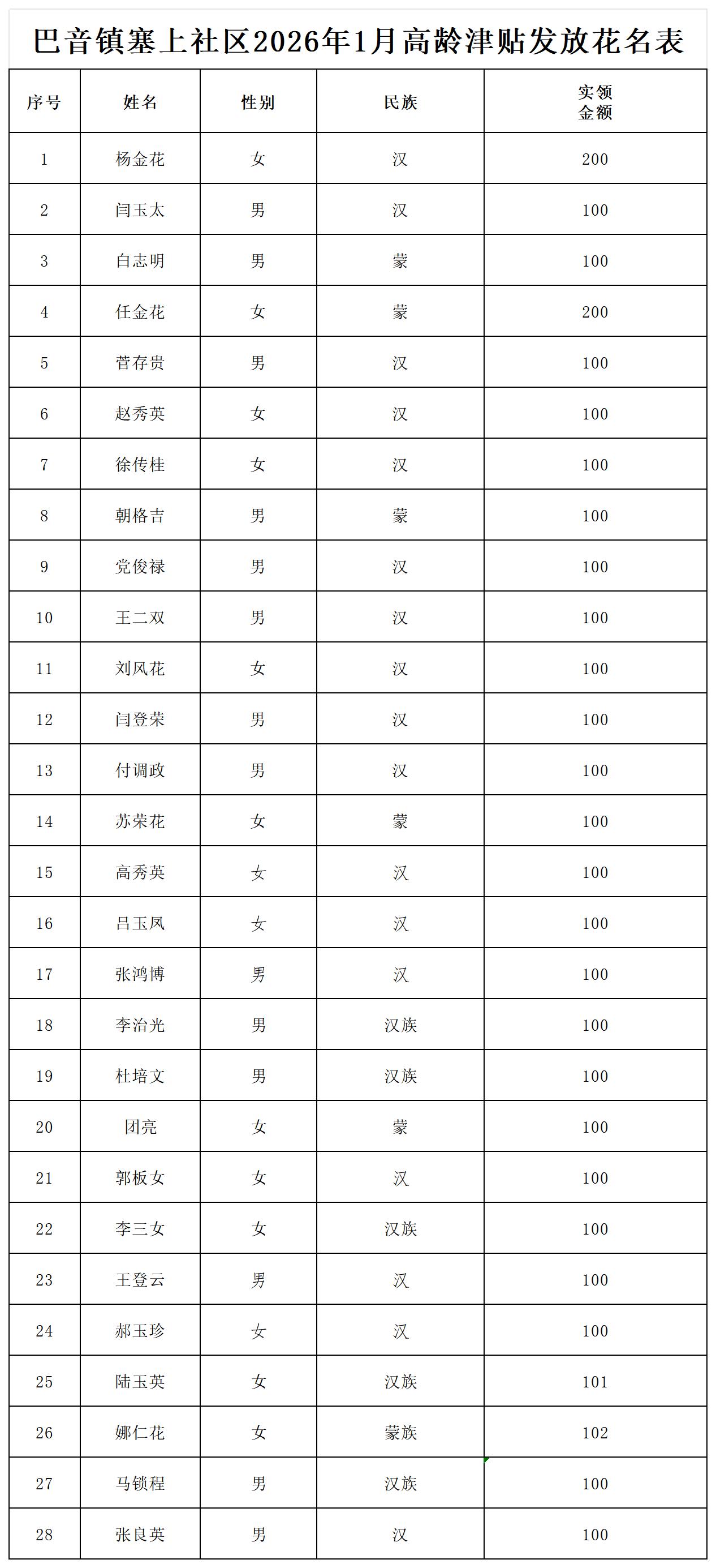 【塞上社区】巴音镇塞上社区2026年1月高龄津贴发放花名表