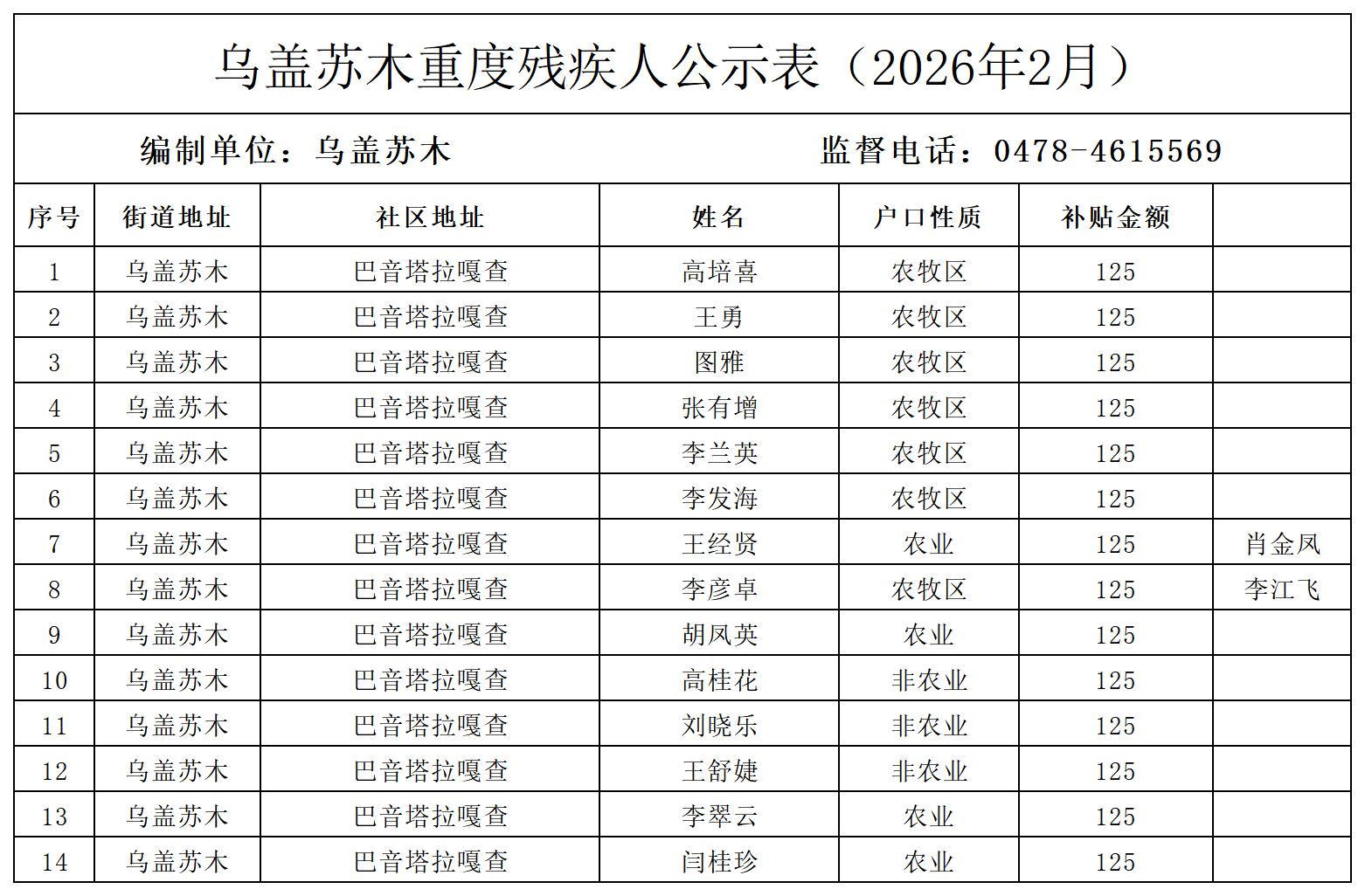 【巴音塔拉嘎查】乌盖苏木巴音塔拉嘎查2026年2月重度残疾人公示表