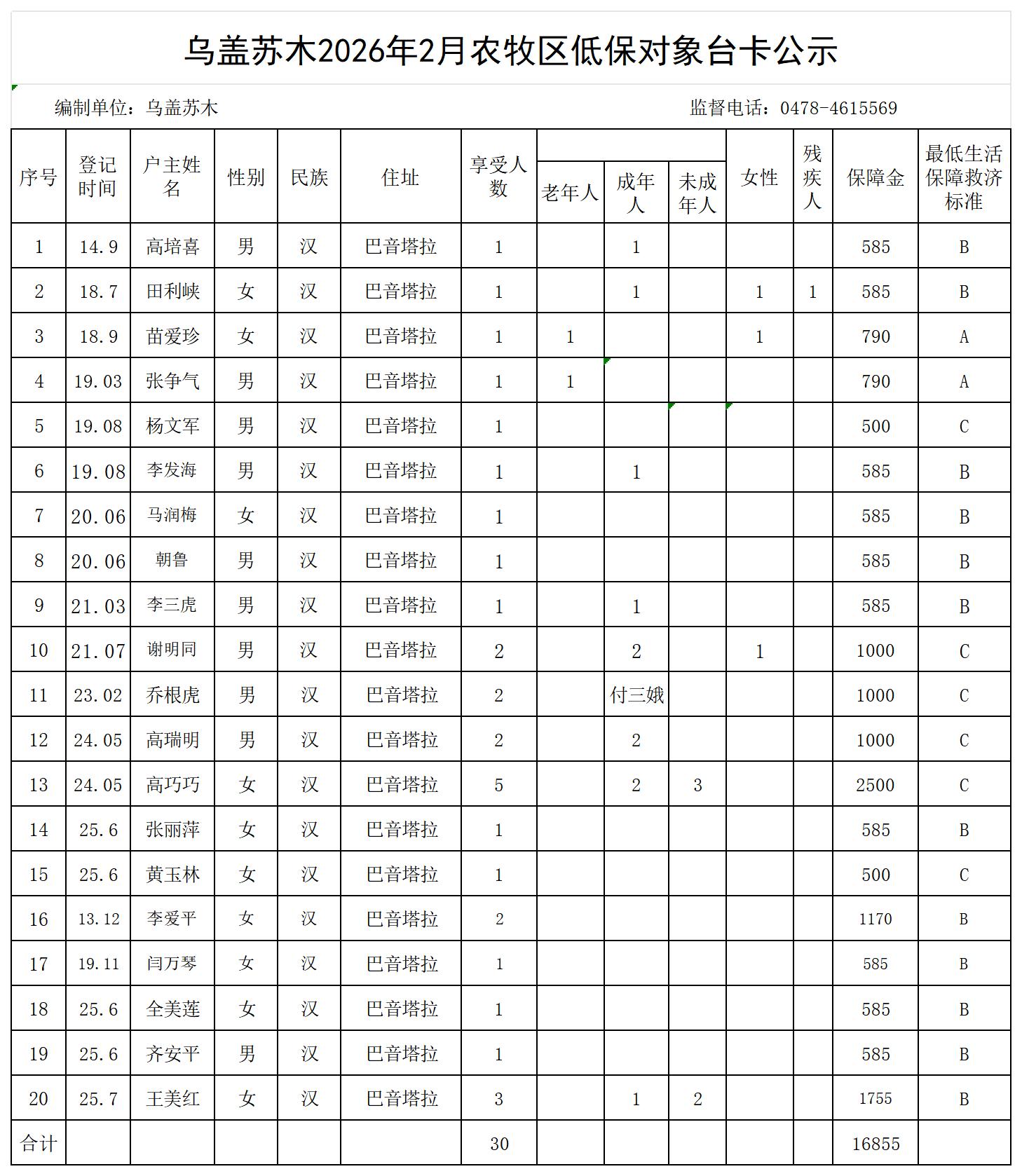 【巴音塔拉嘎查】乌盖苏木巴音塔拉嘎查2026年2月农牧区低保对象公示