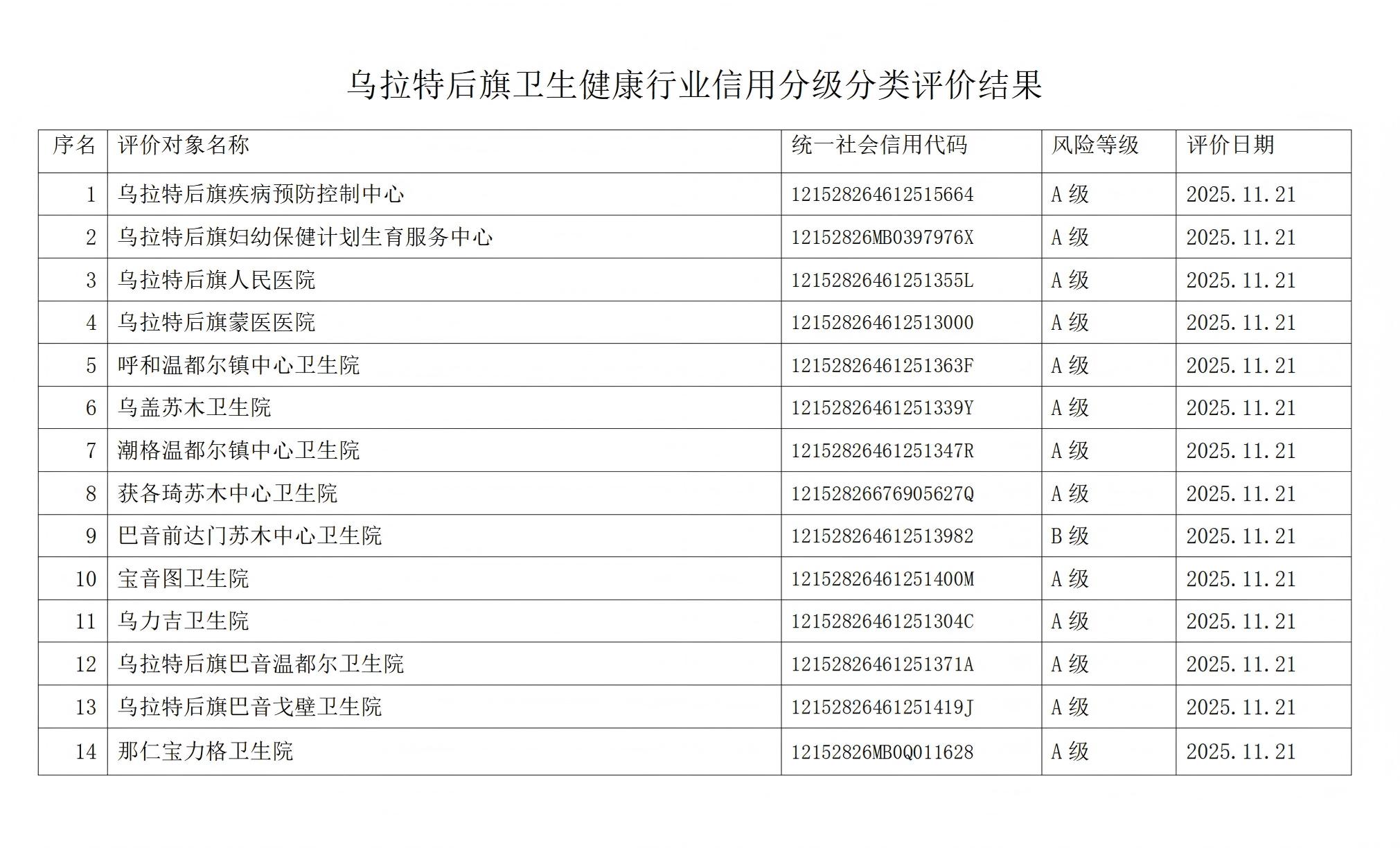 为进一步营造医疗卫生行业诚信意识,促进医疗卫生工作高质量发展,持续推进医疗卫生信用工作,乌拉特后旗卫生健康委员会委托旗卫生健康行政执法大队对本辖区公立医疗卫生机构行业信用开展分级分类评价工作,现将结果公示如下:
