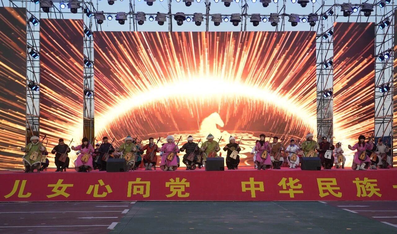 活动在喜庆热烈的氛围中拉开序幕。百人齐奏马头琴,气势恢宏、响彻全场,奏响演出开篇华章。