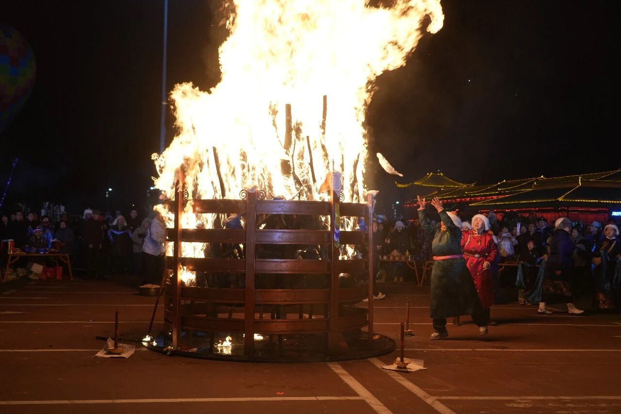 夜幕降临,在40名乌拉特民歌传承人的引领下,熊熊的灶火燃烧了起来,心手相牵的各族儿女怀着虔诚之心绕火祈福,凝聚起民族团结、祈福迎祥的深厚情感。整个仪式在庄重、祥和、热烈的氛围中圆满完成,尽显传统民俗的深厚底蕴与文化魅力。