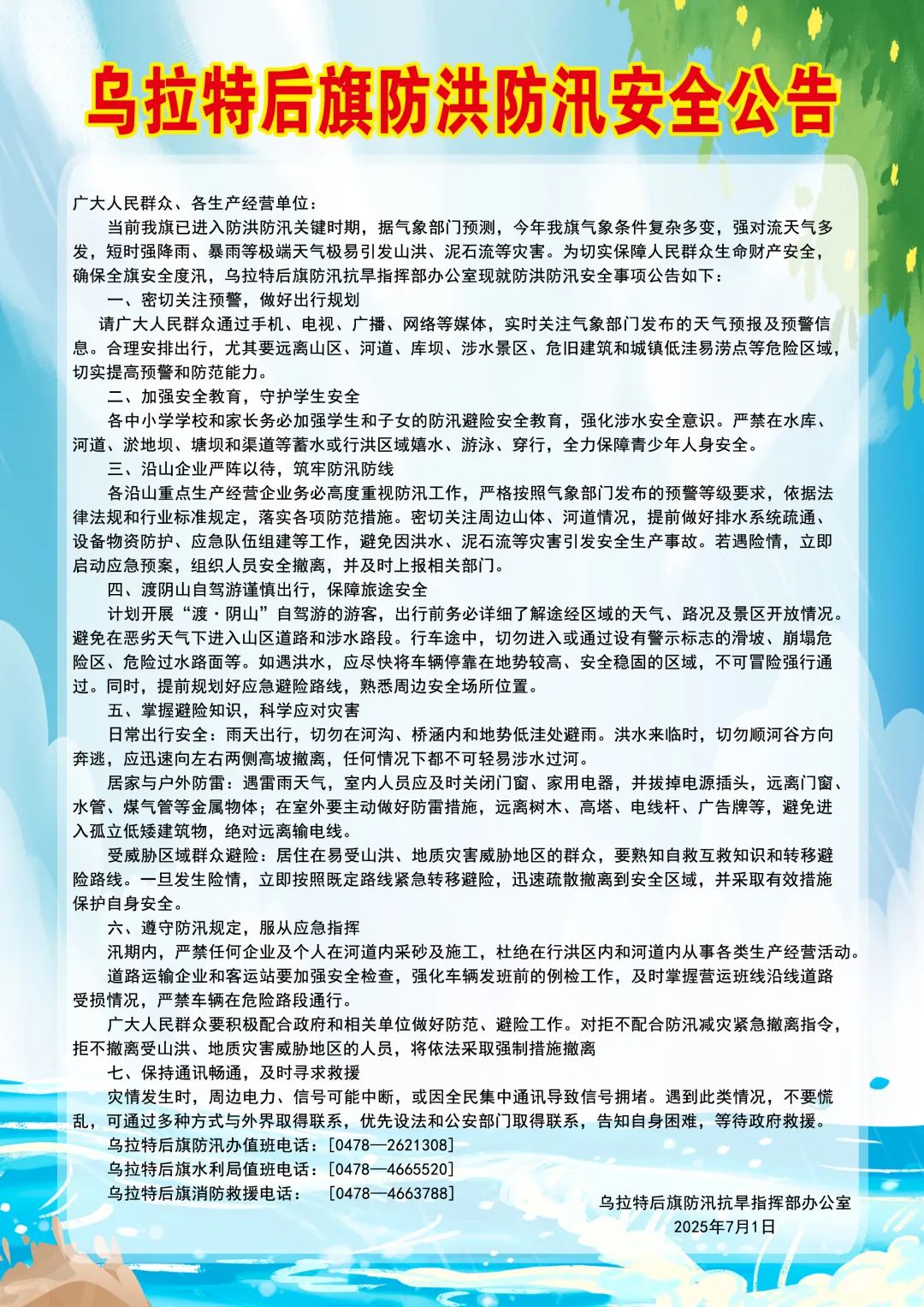 乌拉特后旗防洪防汛安全公告
