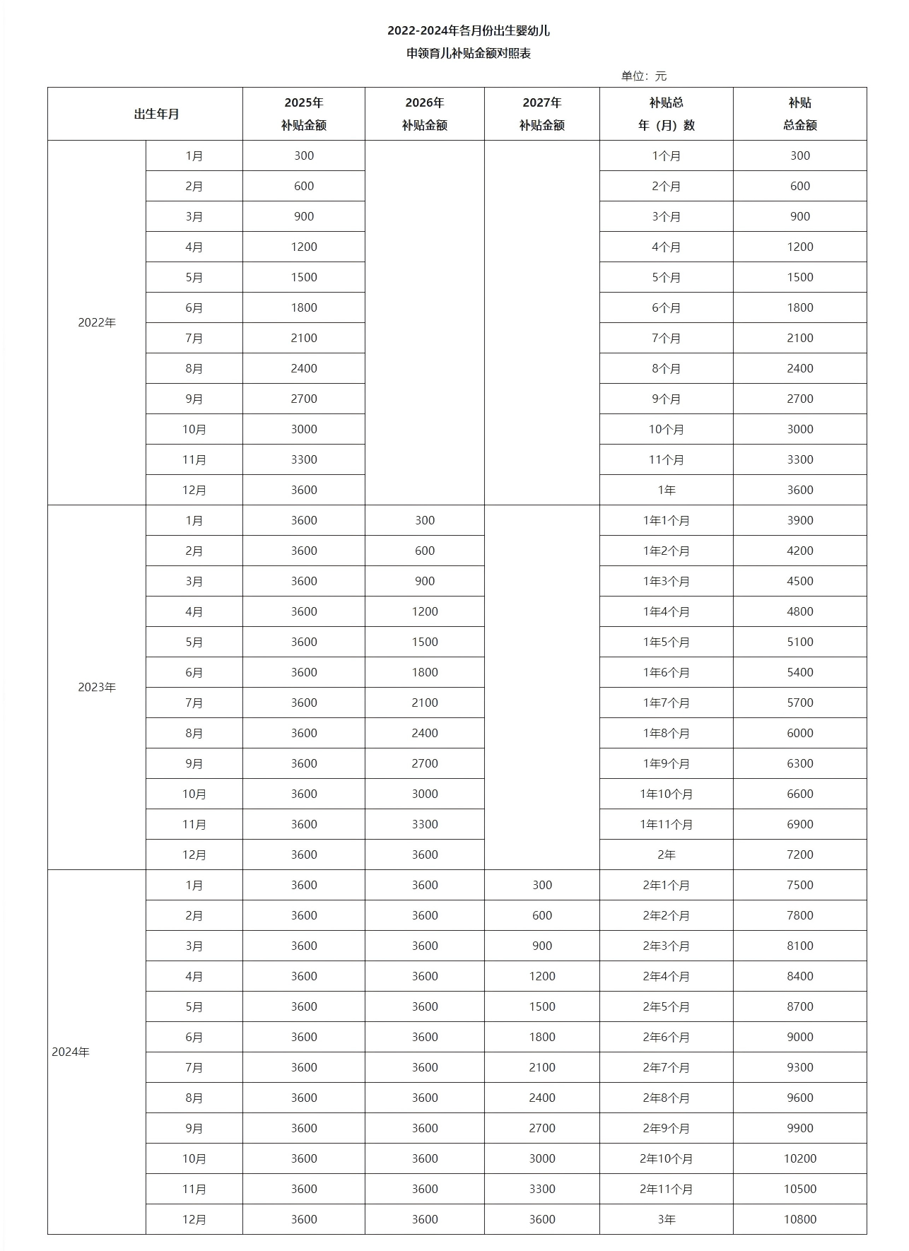 (1)对于2025年1月1日及以后出生的婴幼儿,可连续申领3年补贴,共计10800元。