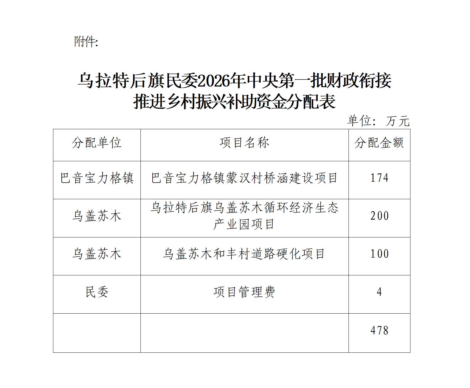 按照《关于提前下达2026年中央财政衔接推进乡村振兴补助资金预算的通知》(巴财农〔2025〕926号)文件精神,2026年提前下达中央衔接推进乡村补助资金478万元。经旗人民政府会议研究审议通过旗民委《关于2026年中央第一批财政衔接推进乡村振兴补助资金(少数民族发展任务)项目使用计划的报告》(乌民委发〔2025〕27号)。现将资金分配结果予以公告。