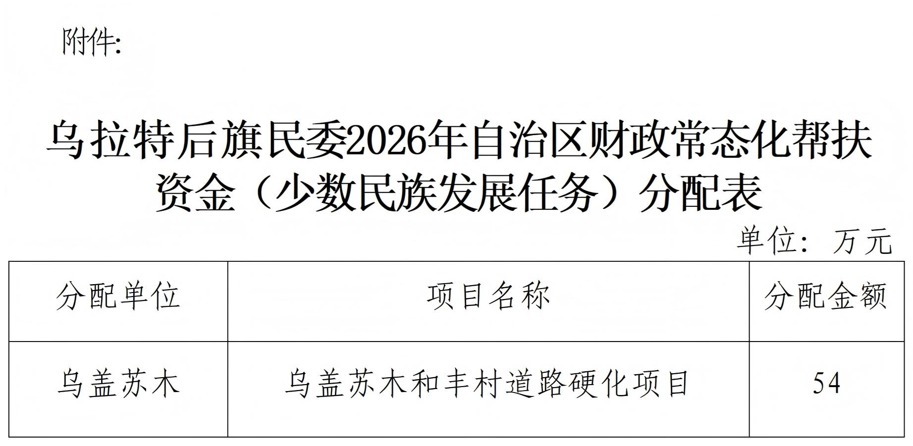 2026年提前下达自治区常态化帮扶资金(少数民族发展任务)资金54万元。经旗人民政府专题会议纪要会议研究审议通过旗民委《关于2026年自治区财政常态化帮扶资金(少数民族发展任务)项目使用计划的报告》(乌民委发〔2026〕1号)。现将资金分配结果予以公告。