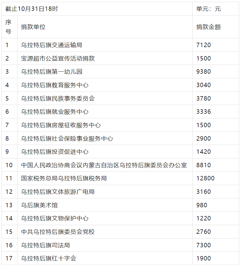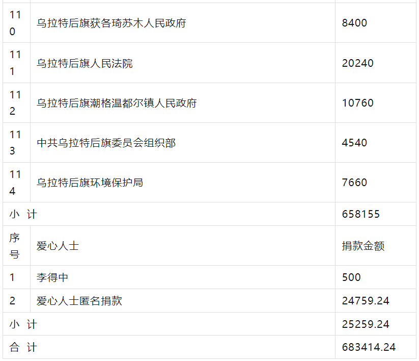 “博爱一日捐”活动自开展以来受到旗委、政府高度重视,得到了各级领导及社会爱心单位、爱心人士的关注,广大干部职工与社会爱心人士慷慨解囊,踊跃捐款,充分发扬了团结互助、扶危济困、助人为乐的中华传统美德,取得了良好的效果,他们积极行动起来、踊跃捐款,为关爱社会弱势群体奉献爱心。截至目前,已收到来自爱心单位及个人的善款共计:683414.24元,现公示如下: