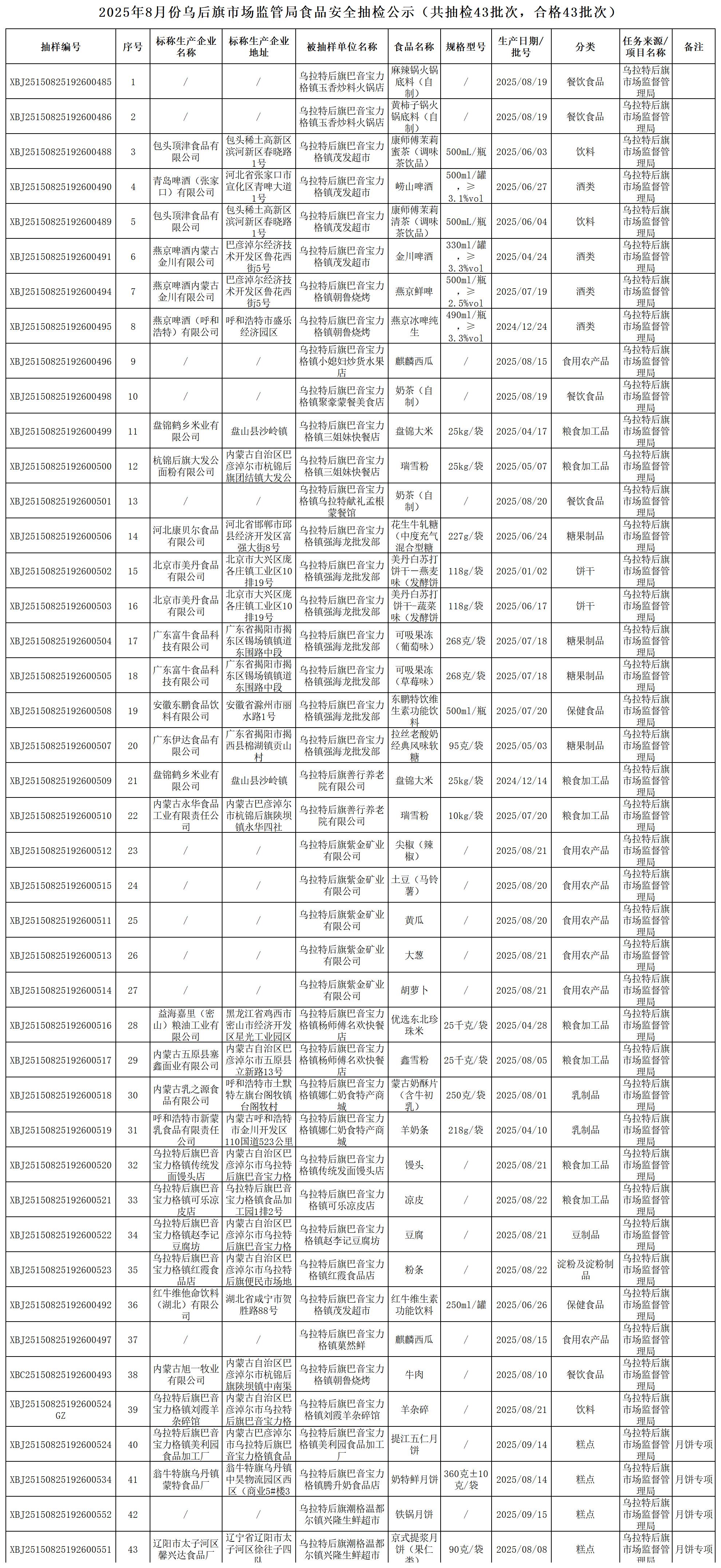 2025年乌后旗市场监管局食品安全抽检公示(共抽检43批次,合格43批次)