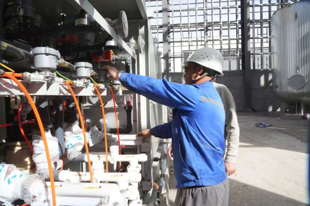 航天热解预处理车间加药装置设备就位,工作人员进行安装。