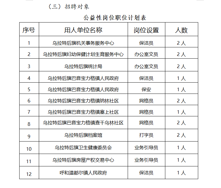 为认真贯彻落实就业援助政策,进一步帮扶就业困难人员就业,依据《内蒙古自治区人力资源和社会保障部门公益性岗位管理办法的通知》(内人社发〔2024〕11号)和《内蒙古自治区就业困难人员认定办法》(内人社办发〔2020〕58号)的有关规定,结合全旗公益性岗位征集情况,本着“公开、公平、公正”的原则,现面向社会公开招聘公益性岗位人员,现将招聘有关事项公告如下: