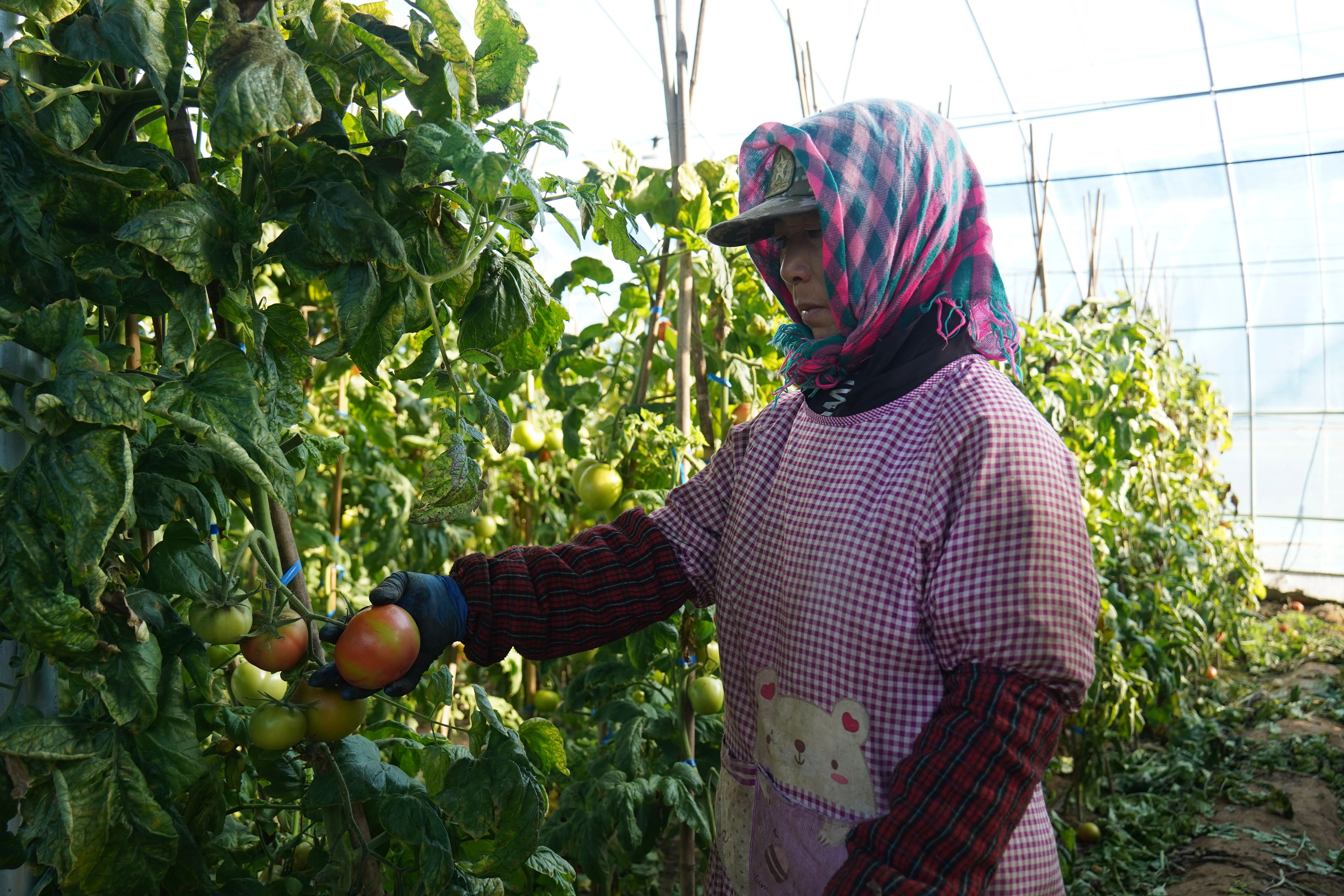 在承包的西红柿大棚里,乌拉特后旗巴音宝力格镇三支渠村村民赵小军正忙着采摘成熟的果实。她手法娴熟地摘下一个个红透的西红柿,将其放入筐中。