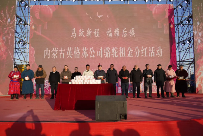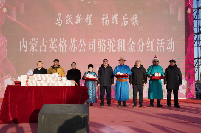 马年新春佳节即将到来之际,2月10日,内蒙古英格苏生物科技有限公司在乌拉特后旗阳山生态广场举行一年一度的骆驼租金分红仪式,60户牧户喜领 320万元“年终奖”。