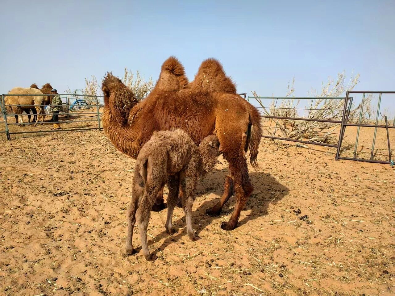 在前达门嘎查戈壁红驼保种基地内,憨态可掬的红驼羔依偎在母驼身旁。