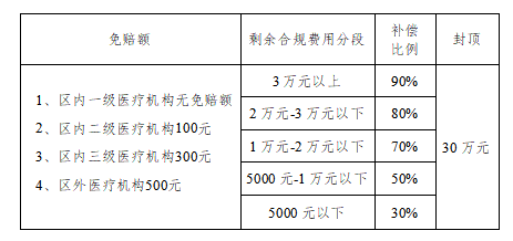 (二)补偿政策:住院可报费用扣除起付线1000元后按50%报销,封顶线为10万元。