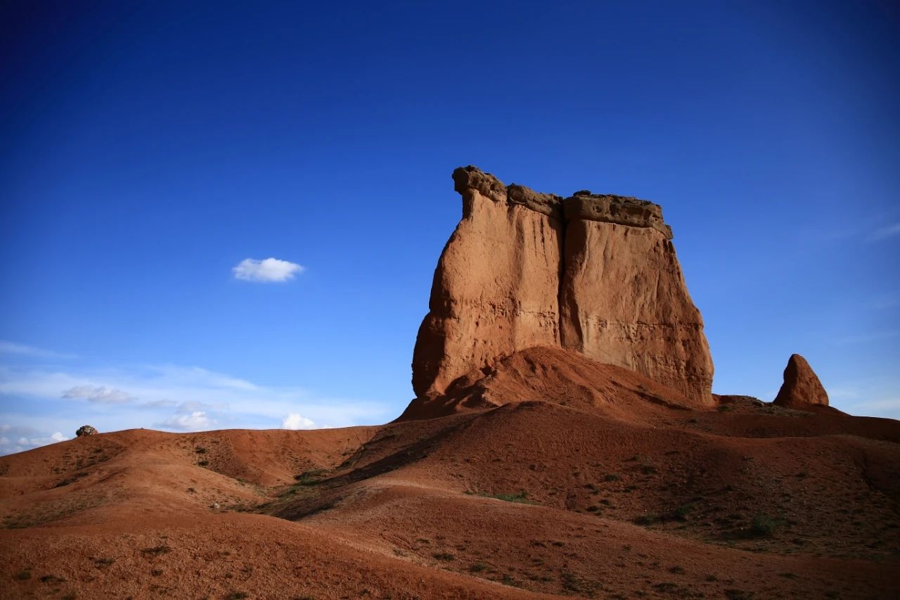 在内蒙古乌拉特后旗的辽阔戈壁中,川吉(神驼)风蚀景观傲然屹立,如同一座由风沙雕琢万年的天然纪念碑。这座因风力侵蚀形成的独特岩体,轮廓酷似一峰昂首远眺的巨驼,其背脊起伏的线条与骆驼温厚而坚毅的神态浑然天成,尤其在日出日落时分,岩体在金色霞光中折射出赭红光泽,恍若传说中庇佑草原的“戈壁红驼”降临凡间,成为摄影家与自然爱好者追逐的“光影圣境”。