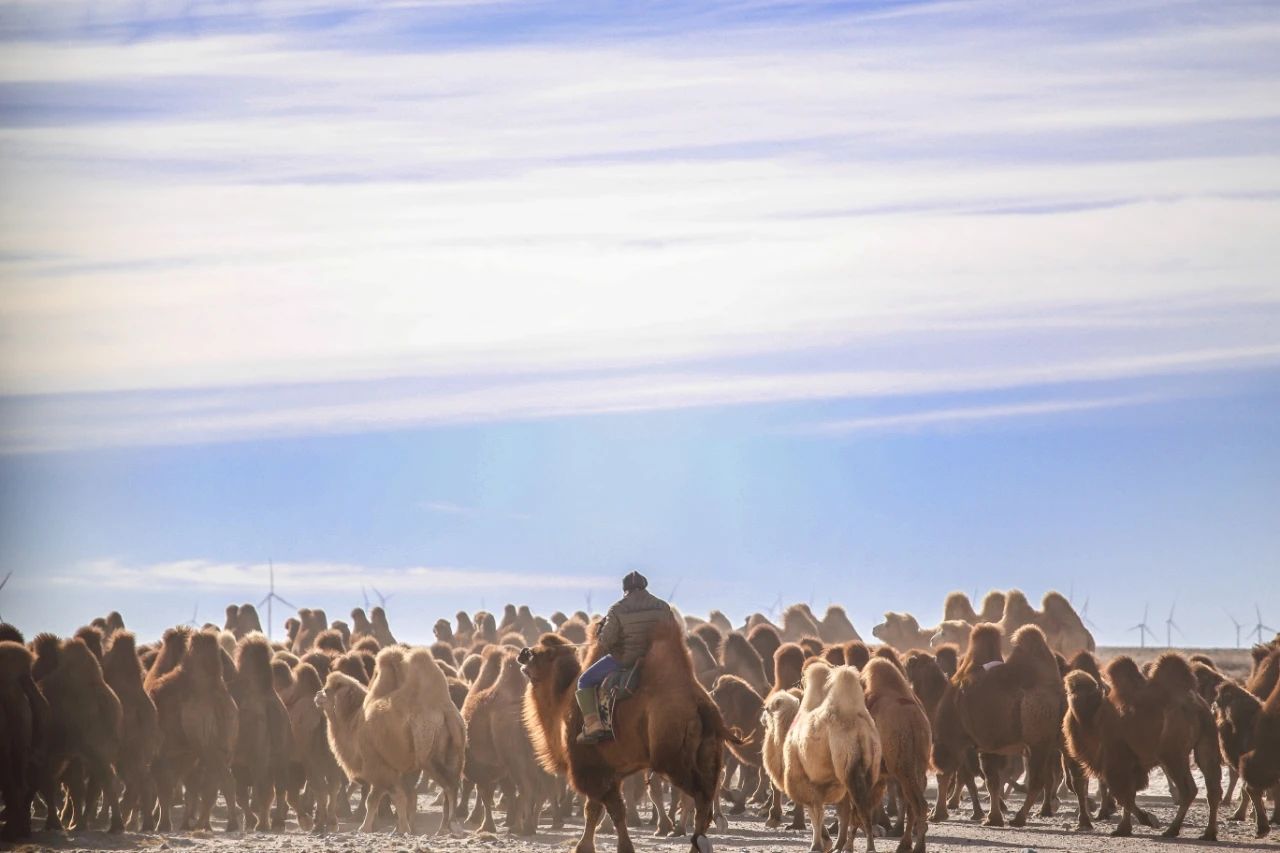 在戈壁红驼之乡乌拉特后旗,牧民赶着驼群倒场是冬季和春季不可错过的壮观景象。