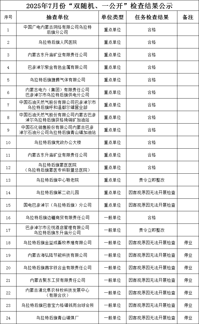 为深化消防执法改革,落实《国务院关于在市场监管领域全面推行部门联合“双随机、一公开”监管的意见》(国发〔2019〕5号)以及相关文件要求,现将乌拉特后旗消防救援大队“双随机、一公开”2025年7月份检查结果、2025年8月份抽查名单公示如下: