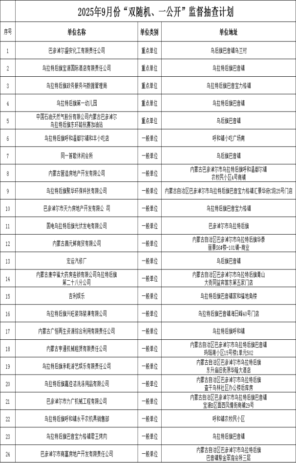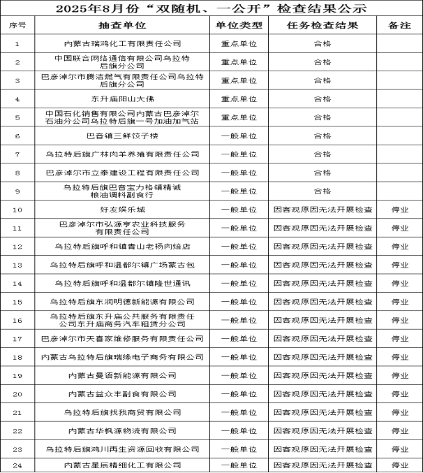 为深化消防执法改革,落实《国务院关于在市场监管领域全面推行部门联合“双随机、一公开”监管的意见》(国发〔2019〕5号)以及相关文件要求,现将乌拉特后旗消防救援大队“双随机、一公开”2025年8月份检查结果、2025年9月份抽查名单公示如下: