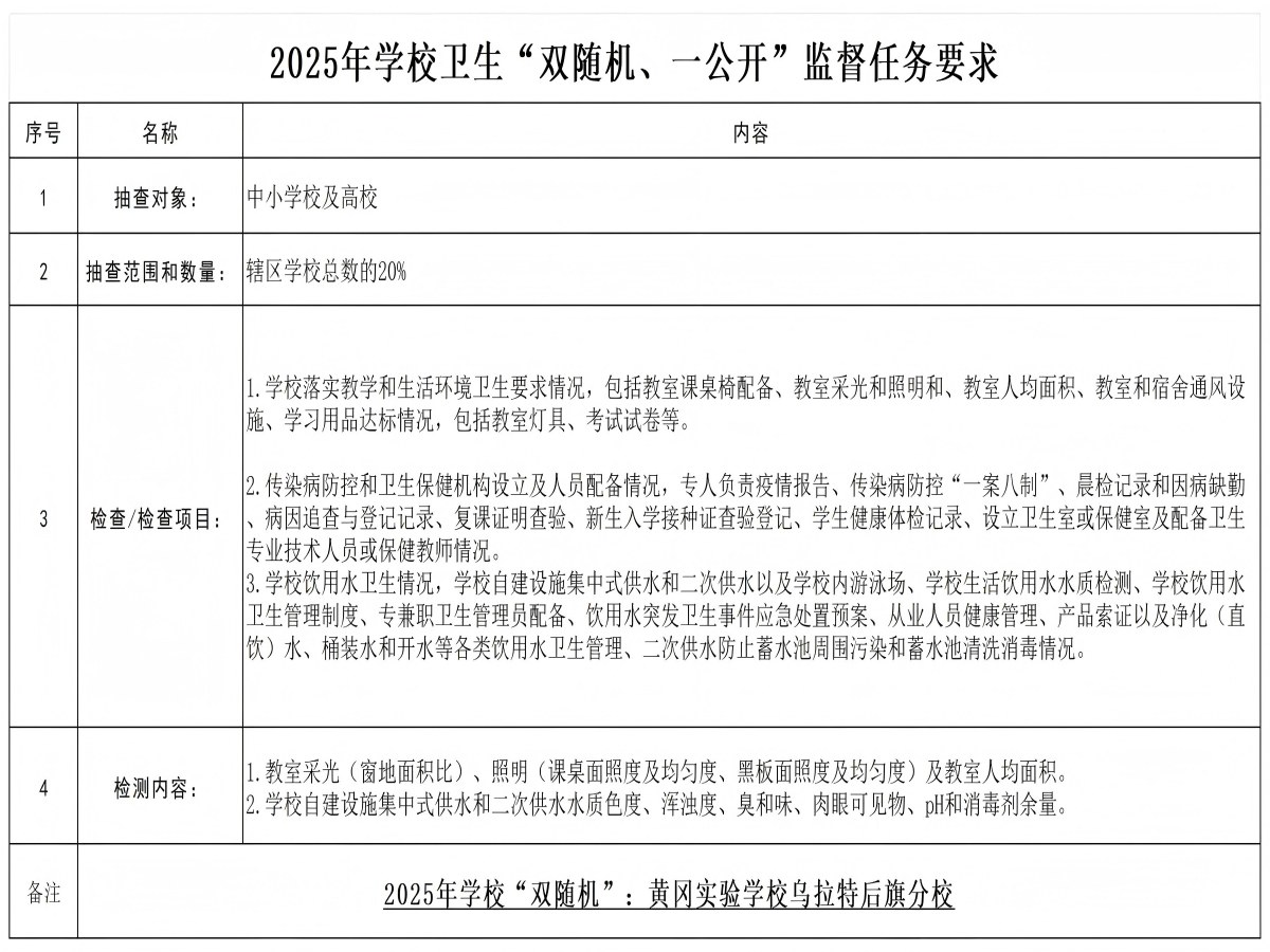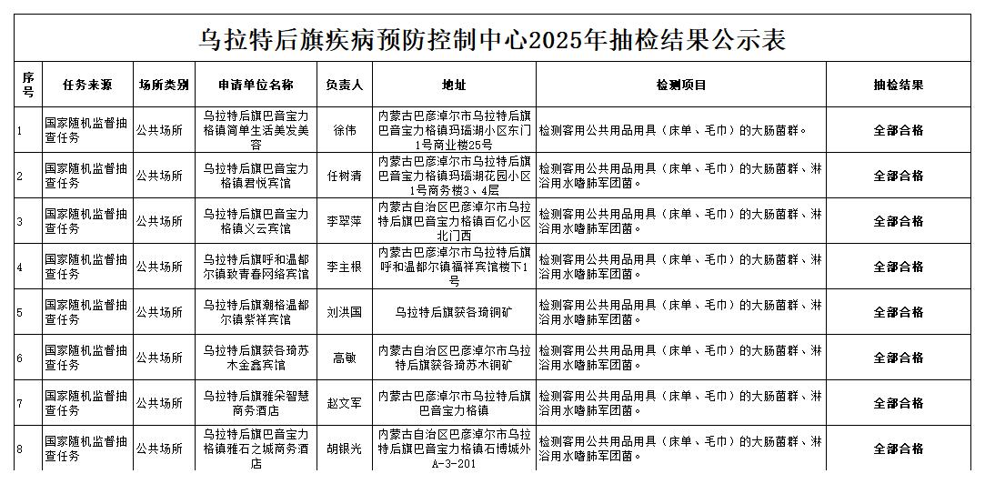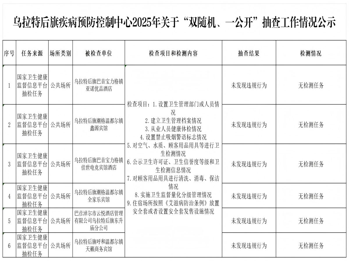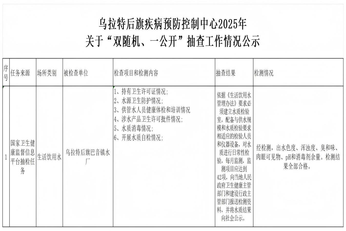 乌拉特后旗疾病预防控制中心2025、公共场所、生活饮用水、学习卫生“双随机、一公开”抽查情况公示表