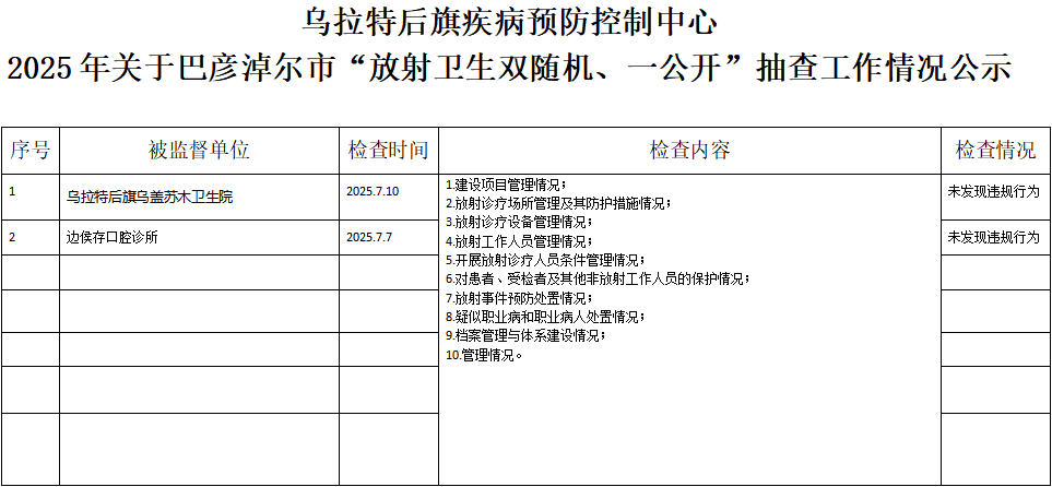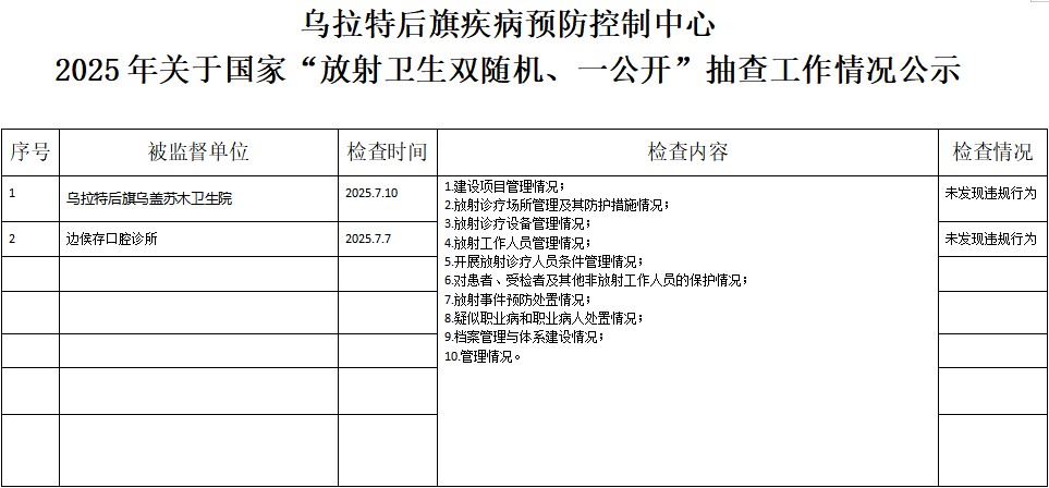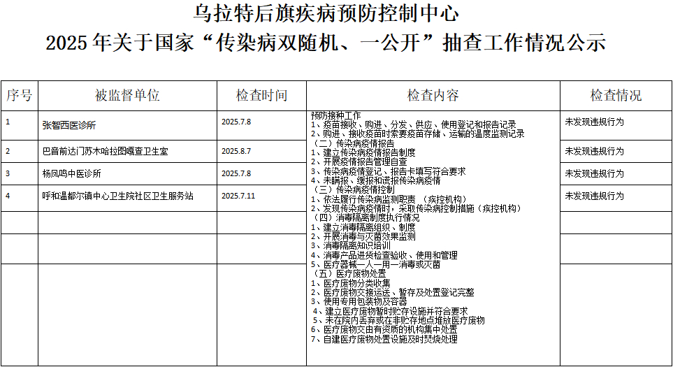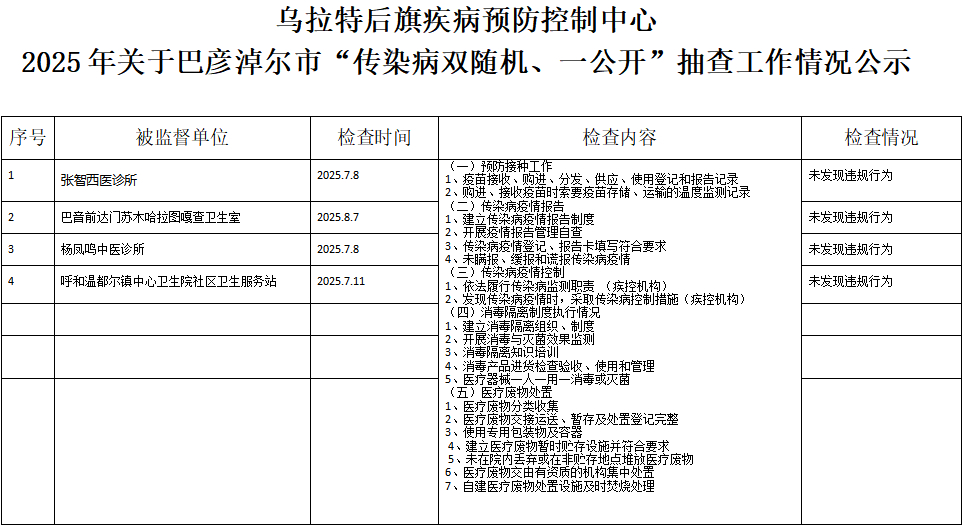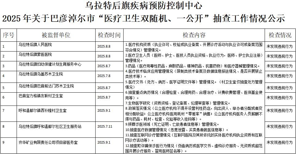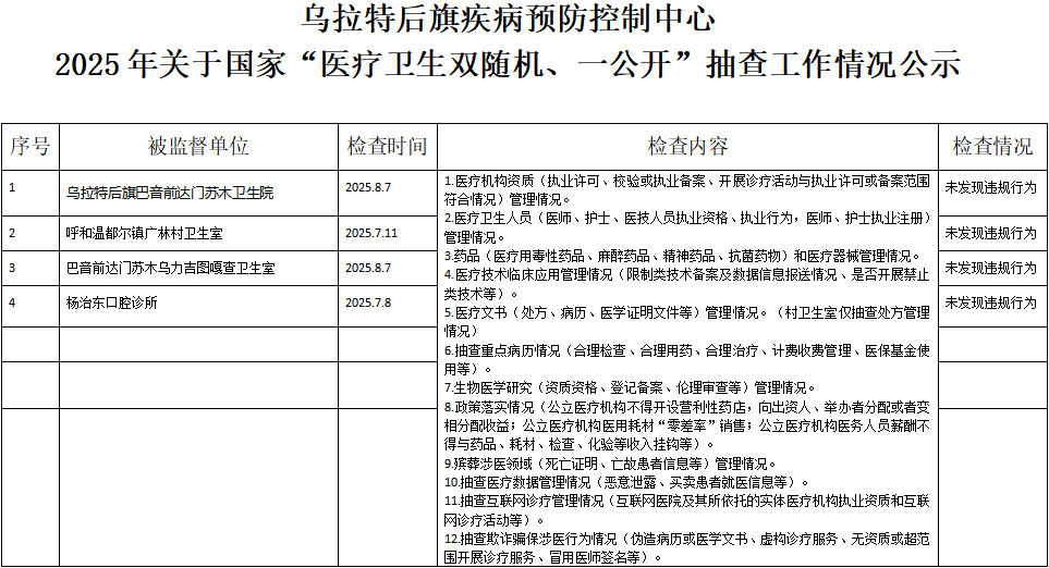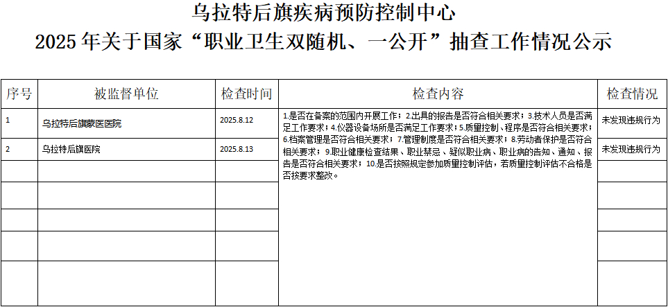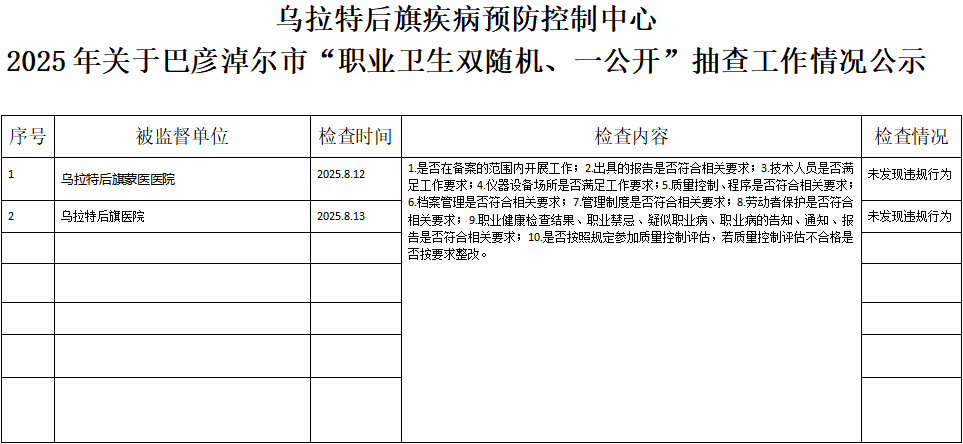 乌拉特后旗疾病预防控制中心2025年关于国家、巴彦淖尔市“双随机、一公开”基本情况公示表