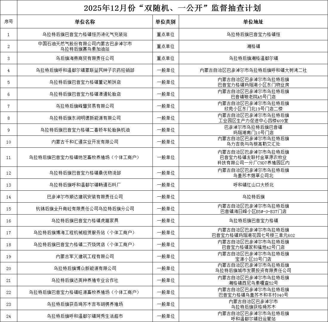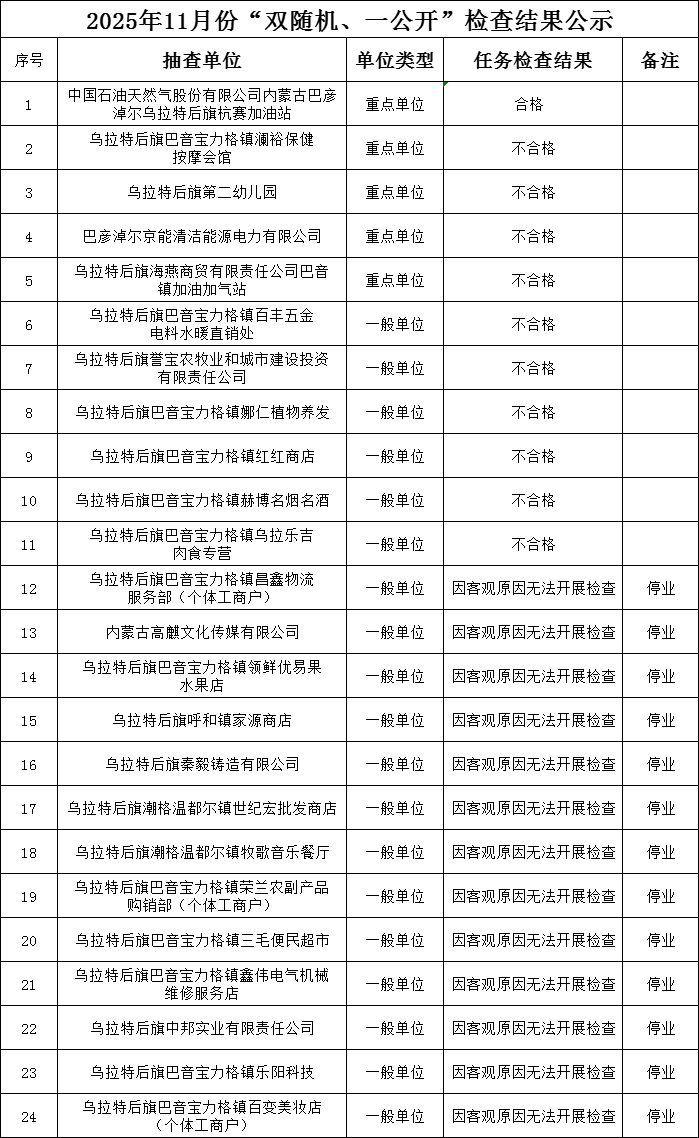 为深化消防执法改革,落实《国务院关于在市场监管领域全面推行部门联合“双随机、一公开”监管的意见》(国发〔2019〕5号)以及相关文件要求,现将乌拉特后旗消防救援大队“双随机、一公开”2025年11月份检查结果、2025年12月份抽查名单公示如下:
