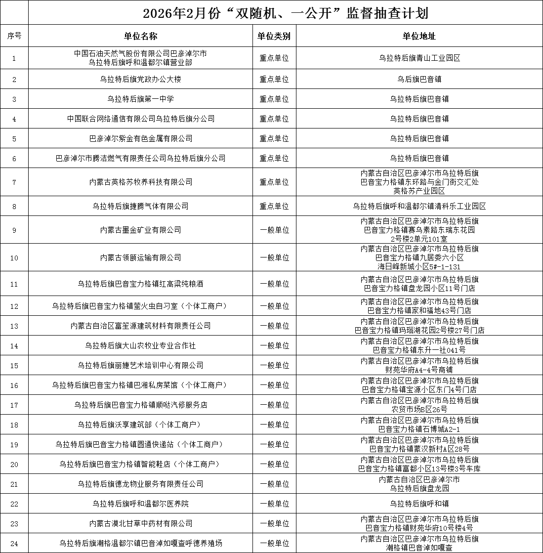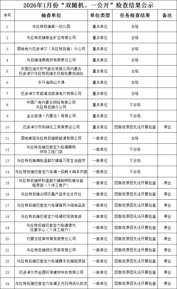 为深化消防执法改革,落实《国务院关于在市场监管领域全面推行部门联合“双随机、一公开”监管的意见》(国发〔2019〕5号)以及相关文件要求,现将乌拉特后旗消防救援大队“双随机、一公开”2026年1月份检查结果、2026年2月份抽查名单公示如下: