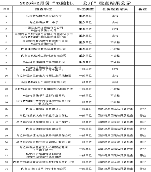 为深化消防执法改革,落实《国务院关于在市场监管领域全面推行部门联合“双随机、一公开”监管的意见》(国发〔2019〕5号)以及相关文件要求,现将乌拉特后旗消防救援大队“双随机、一公开”2026年2月份检查结果、2026年3月份抽查名单公示如下: