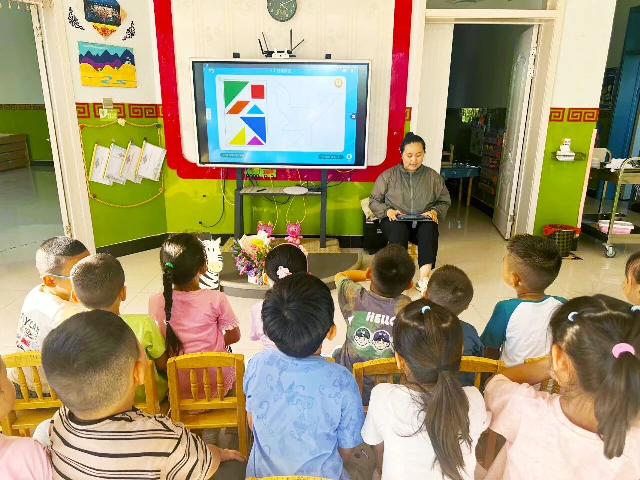 乌拉特后旗第一幼儿园教师使用“平板电脑+课堂互动”教学模式给孩子们讲授颜色与图形