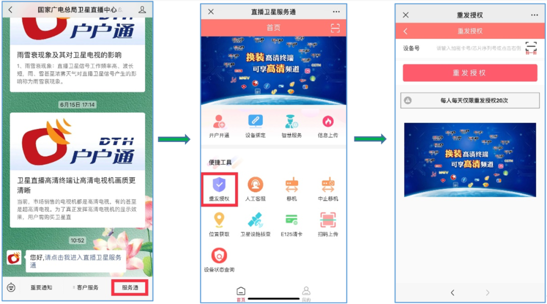 关注“国家广电总局卫星直播中心”官方微信公众号,点击公众号下方“服务通”菜单,点击“请点击我进入直播卫星服务通”进入“直播卫星服务通”页面,点击“重发授权”功能后扫描或输入加密卡号,进行自助重发授权。