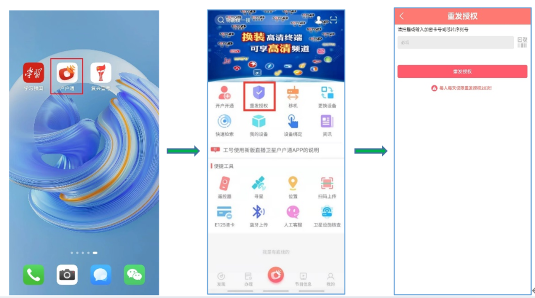 打开“户户通”手机APP,点击“重发授权”功能后扫描或输入加密卡号,进行自助重发授权。